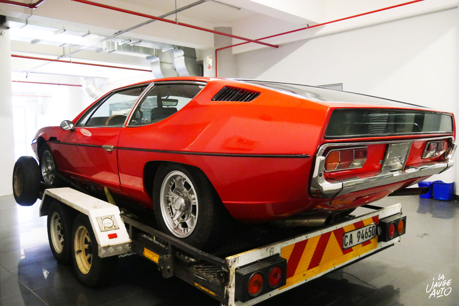 Un peu plus loin, dans un couloir, une Lamborghini Espada posée sur une remorque et bien entourée par deux agents de sécurité ! Pas dans un état concours mais il n’empêche que ça reste une Lamborghini au pays de Nelson Mandela.